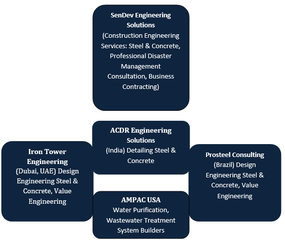 SenDev Engineering Solutions provides construction engineering, IT security risk advisory and advanced water purification & treatment systems based solutions for companies aligned in various industries and sectors like Retail, Construction, Oil & Gas, Mining, Manufacturers, Pharmaceutical, Financial & Insurance, Education and other technology companies. With the right blend of associate companies, experience and youth of 400+ years of combined experience, we offer innovative, customized, flexible solutions in IT audits, risk assessment, structural design, estimation & detailing, advanced water treatment systems around the world.